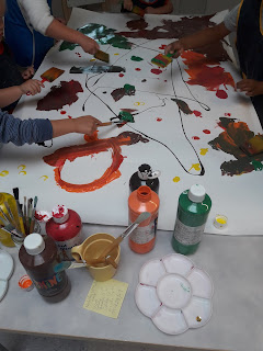 Vi har under våra promenader valt att låta barnen få samla in löv, bokollon, pinnar och stenar för att gemensamt kunna göra en hösttavla. Under veckan har barnen fått måla på ett stort spännpapper och då har de pratat om vilka färger som finns under hösten.